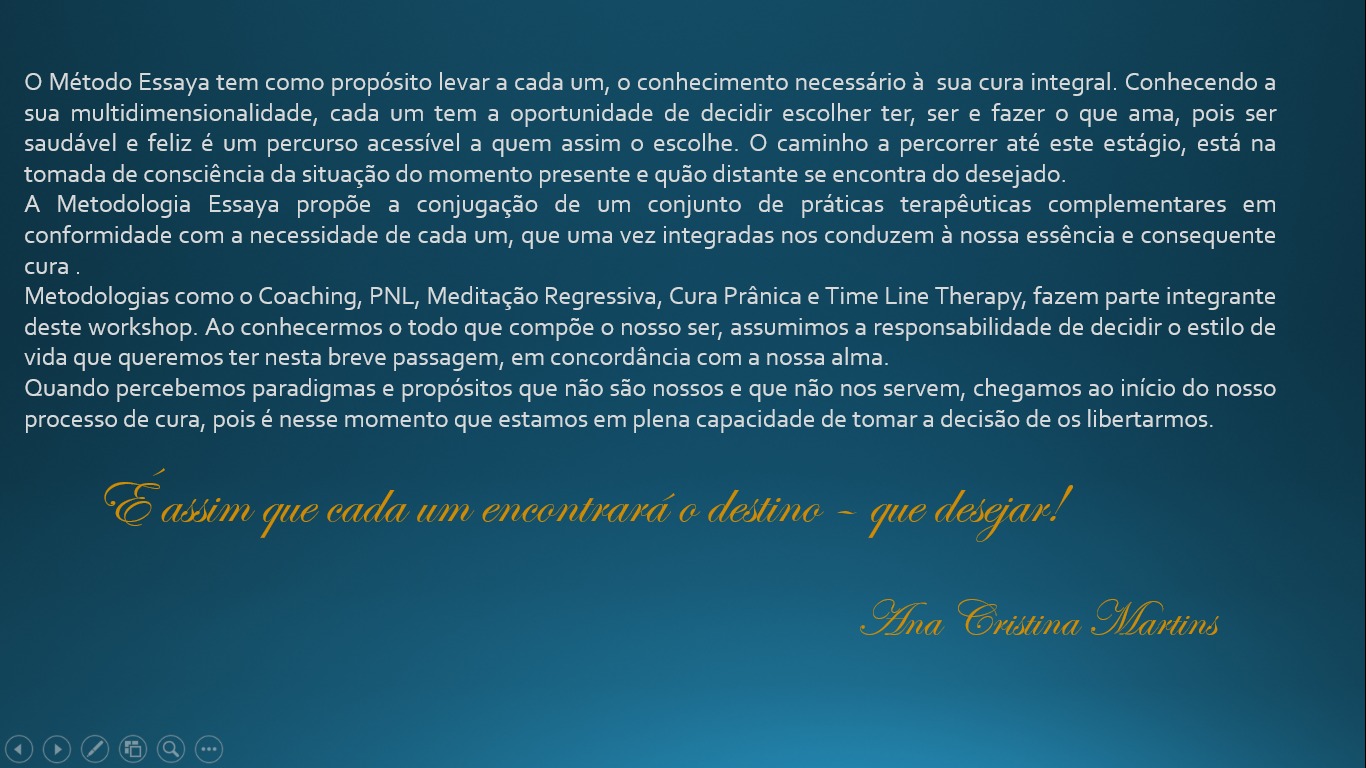 O Método Essaya é a formação que irá permitir-lhe descobrir o que o impede de ser, fazer e até mesmo ter o que tanto deseja, porque ser saudável e feliz é acessível a quem tem a coragem de assim o decidir. Com as estratégias certas que eu lhe vou ensinar, irá descobrir a pessoa magnífica que habita dentro de ti capaz de conseguir realizar os seus maiores sonhos.