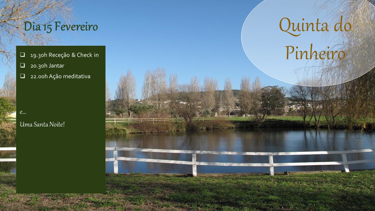 Um passeio nocturno com a mente em silêncio pela Quinta do Pinheiro, permite-lhe aumentar a sua capacidade de se focar numa só coisa ou circunstância. O escutar dos pássaros e outros sons da natureza à luz do luar, encerrarão as actividade do dia.