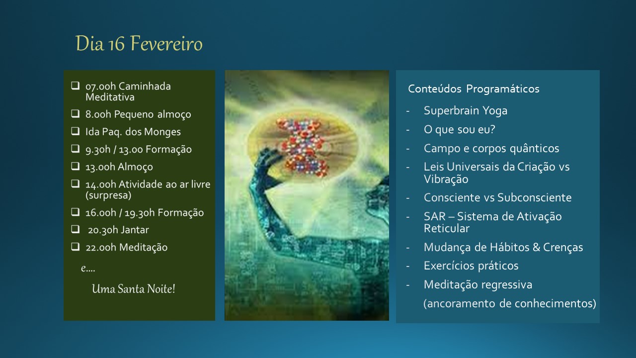 Trata-se de Yoga para a sua mente/corpo que lhe proporciona o aumento da sua capacidade de concentração, melhoramento da sua inteligência e memória. Activando centros neuronais por vezes adormecidos, a prática do SuperBrain Yoga estimula e potencializa consideravelmente as capacidades cerebrais de quem o pratica. Aumenta e organiza a gestão da energia vital em todo o corpo pois todos os centros energéticos são alinhados automaticamente. Quando todo o seu corpo está alinhado, todo o seu campo electromagnético e consequentemente toda a sua realidade começa a alinhar-se a caminho da saúde e abundância em todas as áreas da sua vida. Porquê? Porque desta forma o movimento natural do seu campo quântico faz-se no sentido correto, enquanto que com todas as dúvidas, preocupações e incompreensões do dia a dia, coloca o campo em contra-movimento sendo este a origem dos desencontros na materialidade da vida em que se encontra. A explicação do campo toroidal ou campo quântico faz parte desta formação para que compreenda o sistema que você é!